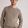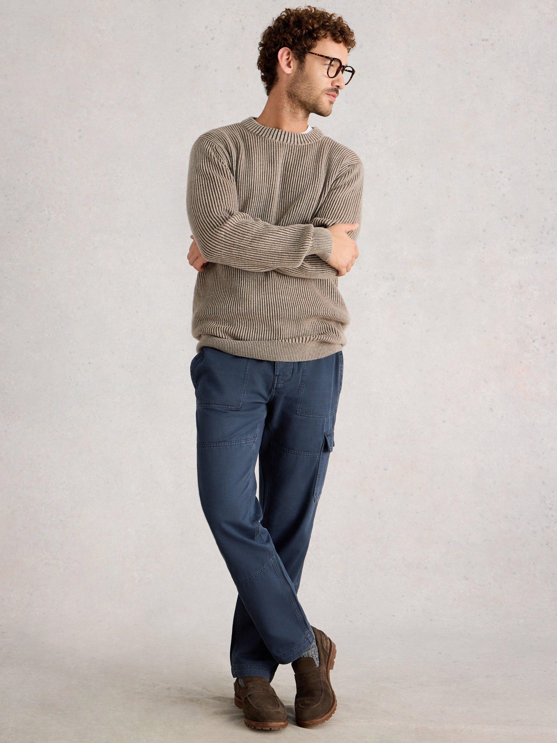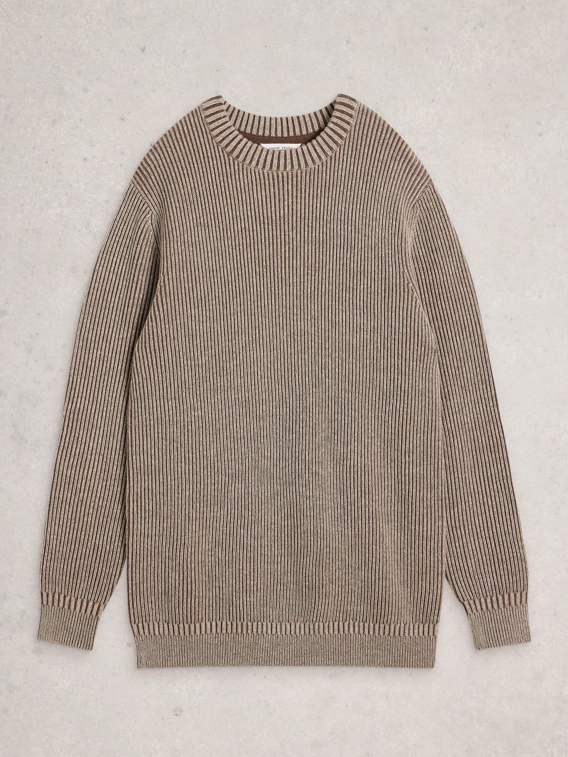 A crew neck knit with an interesting acid wash. And a ribbed, ridged effect we can’t get enough of. (Something along those lines.)