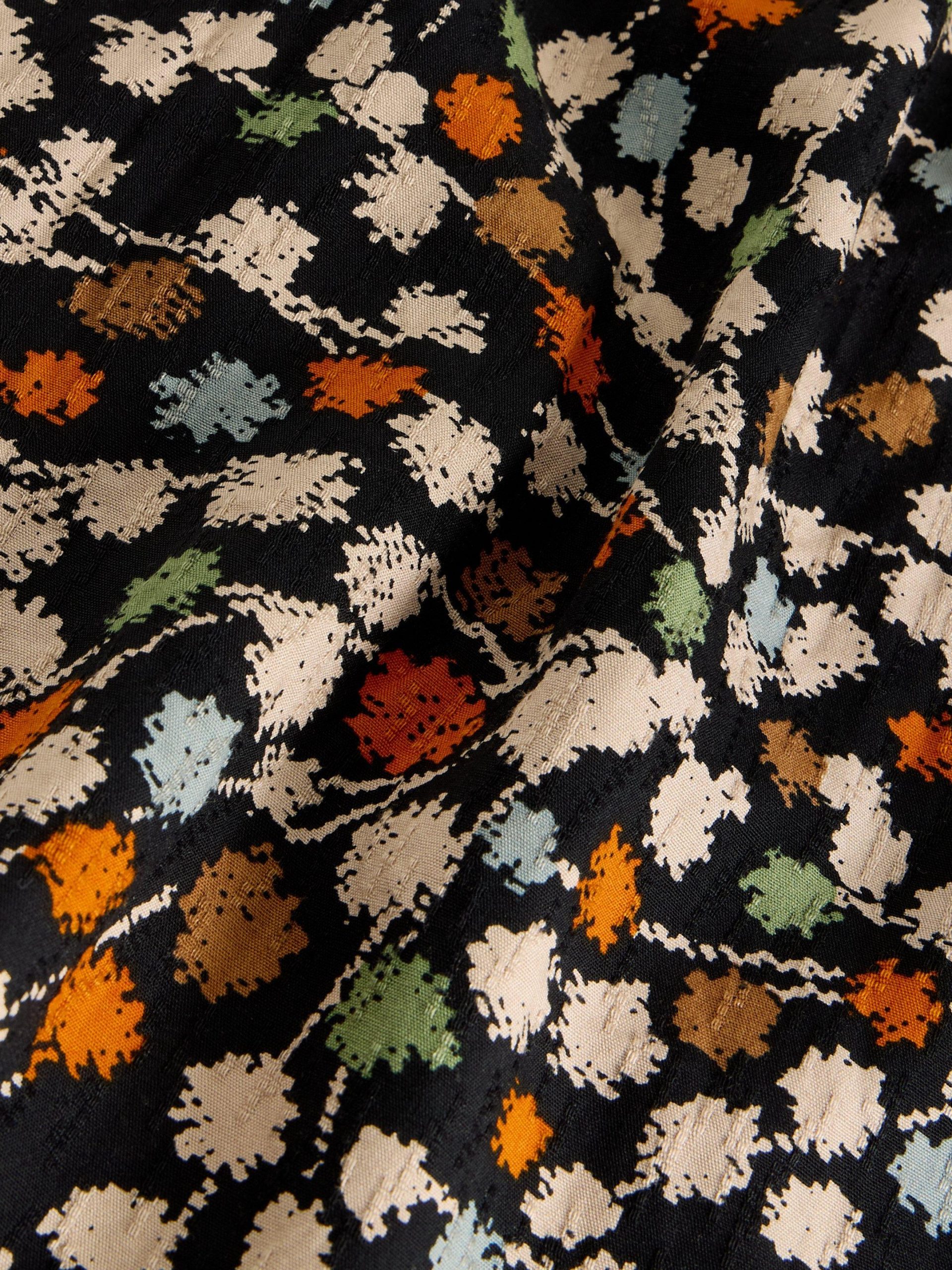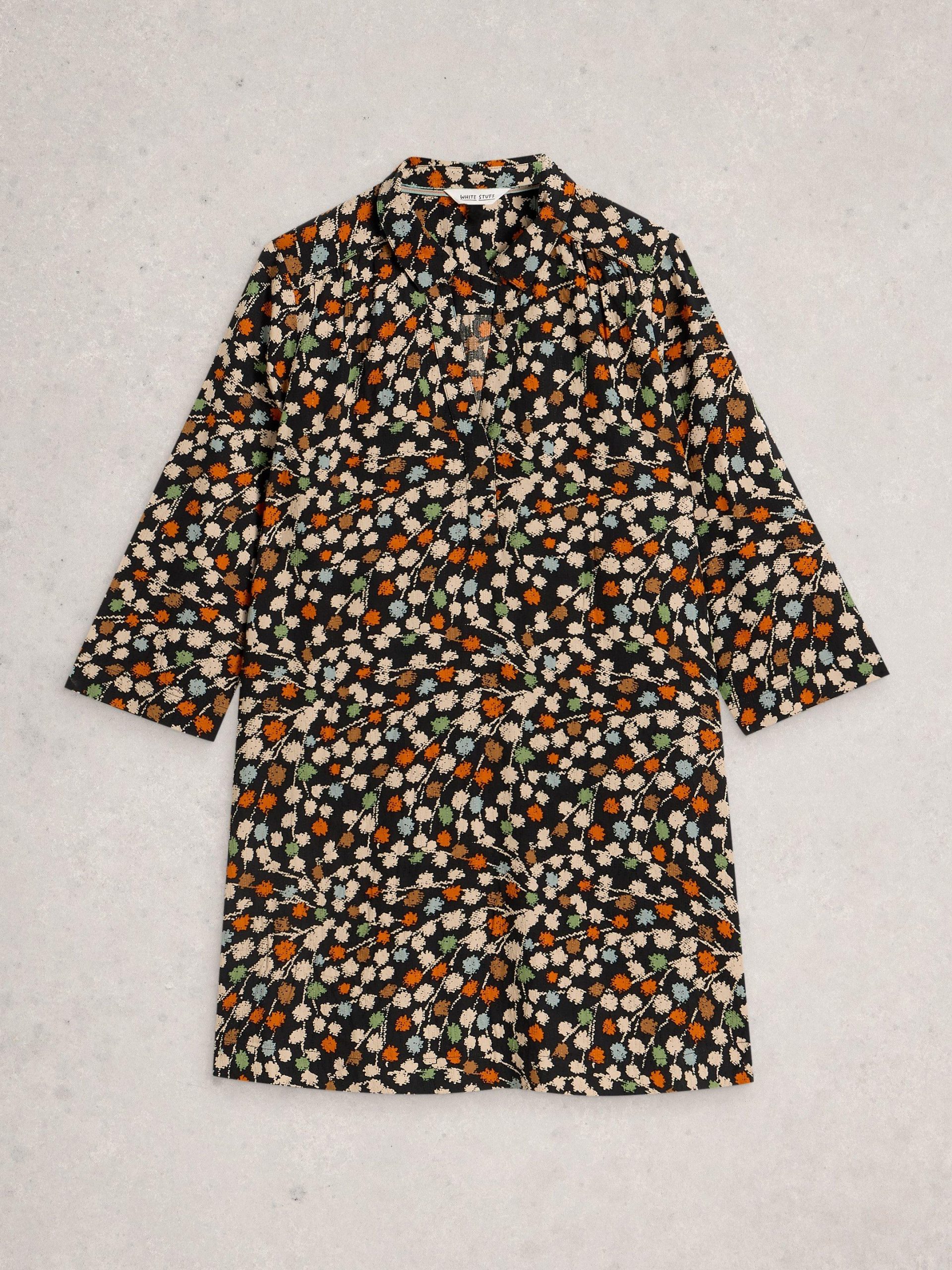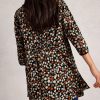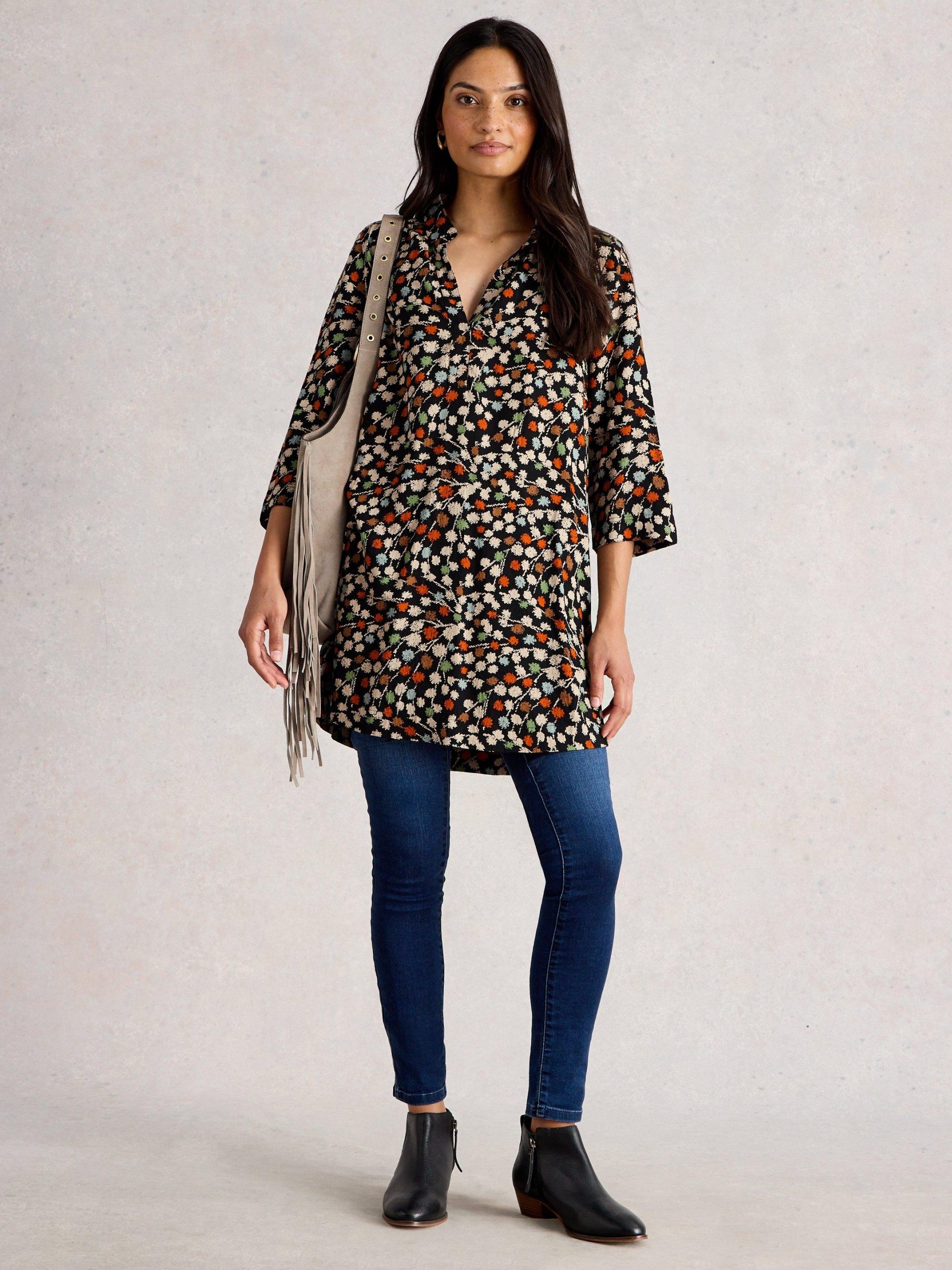 A tunic with a print that reminds us of autumn leaves. And it looks great with jeggings and ankle boots.
