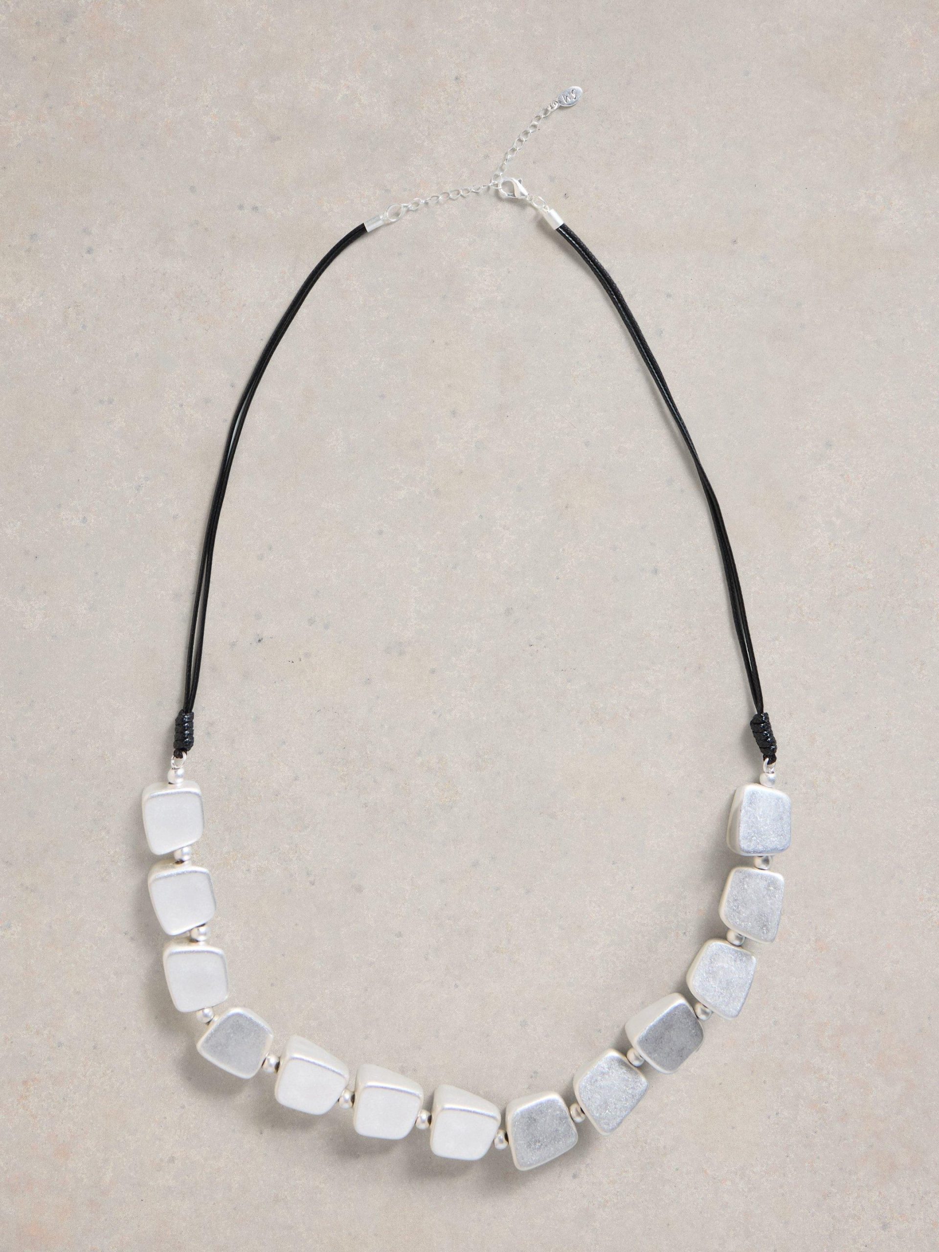 A mixed-texture necklace adorned with thirteen silver cubes. With beads placed between each one. Because every detail counts.