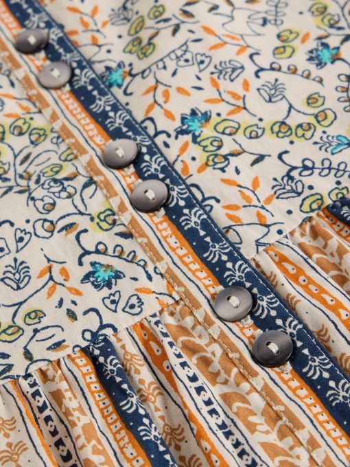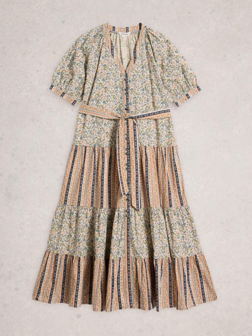 A dreamy midi with a patchwork-style print. It’s tiered. Has a tie-waist detail. And it reminds us of weekend getaways somewhere warmer. Soaking in the last few hours of sun.