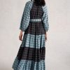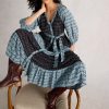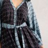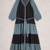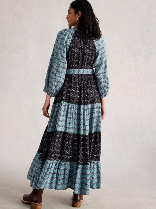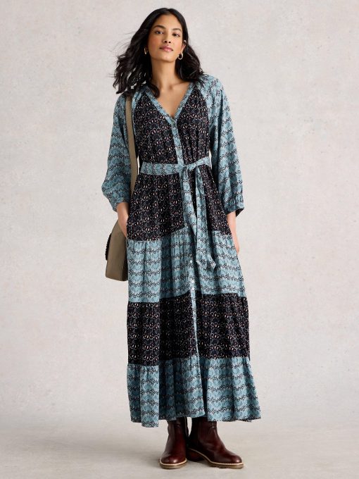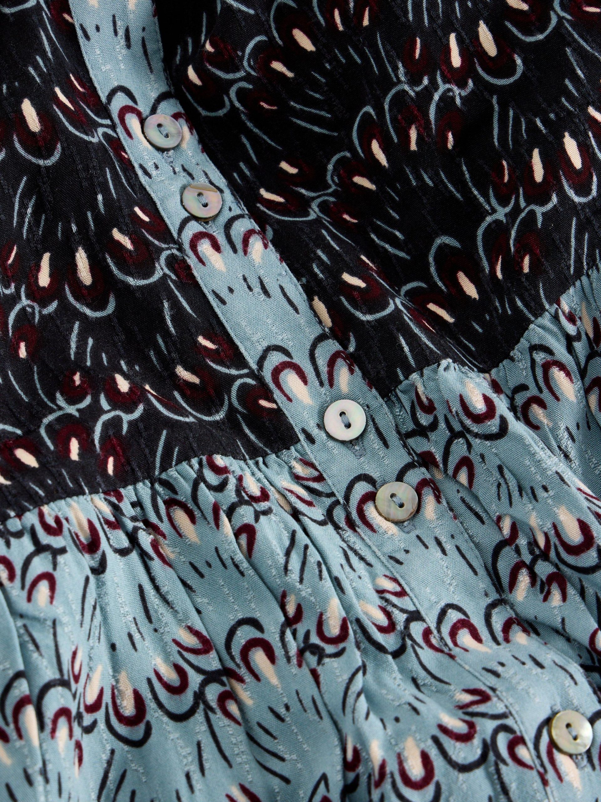 A tiered, tie-waist dress with colourblocking. And a pattern we’re intrigued by. Are they flowers? Feathers? (It’s going in our basket either way.)