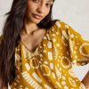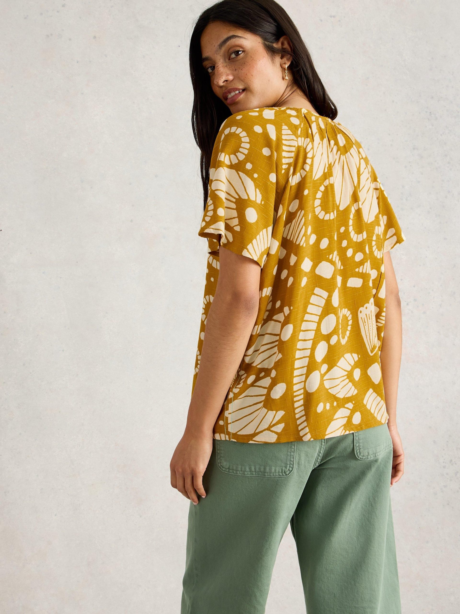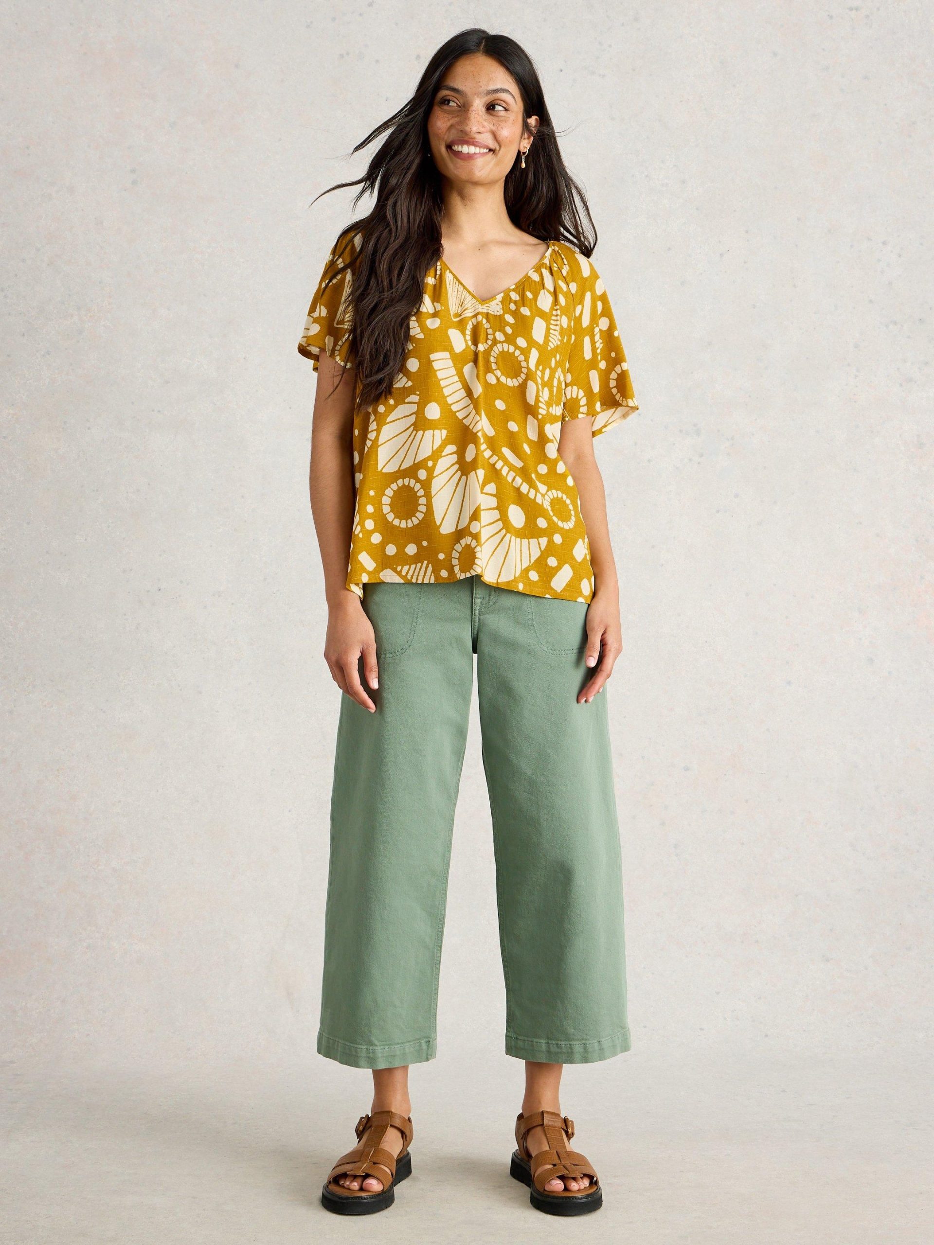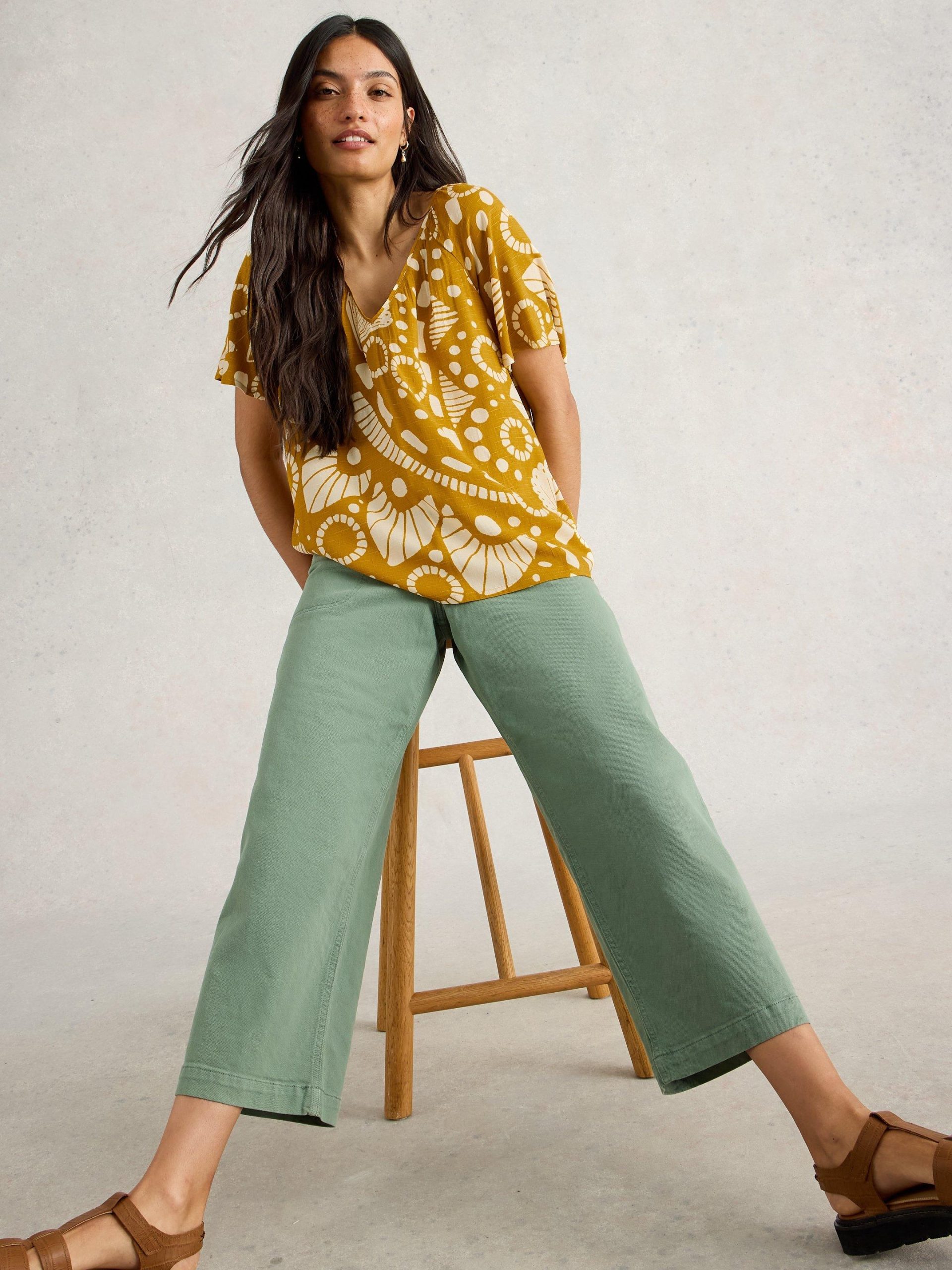 This pretty v neck top is made with 100% EcoVero viscose. It’s soft and drapey. With a dreamy, dapple-y print. We love it with wide leg jeans and boots. (It gives a cool, 70s kind of vibe.)
