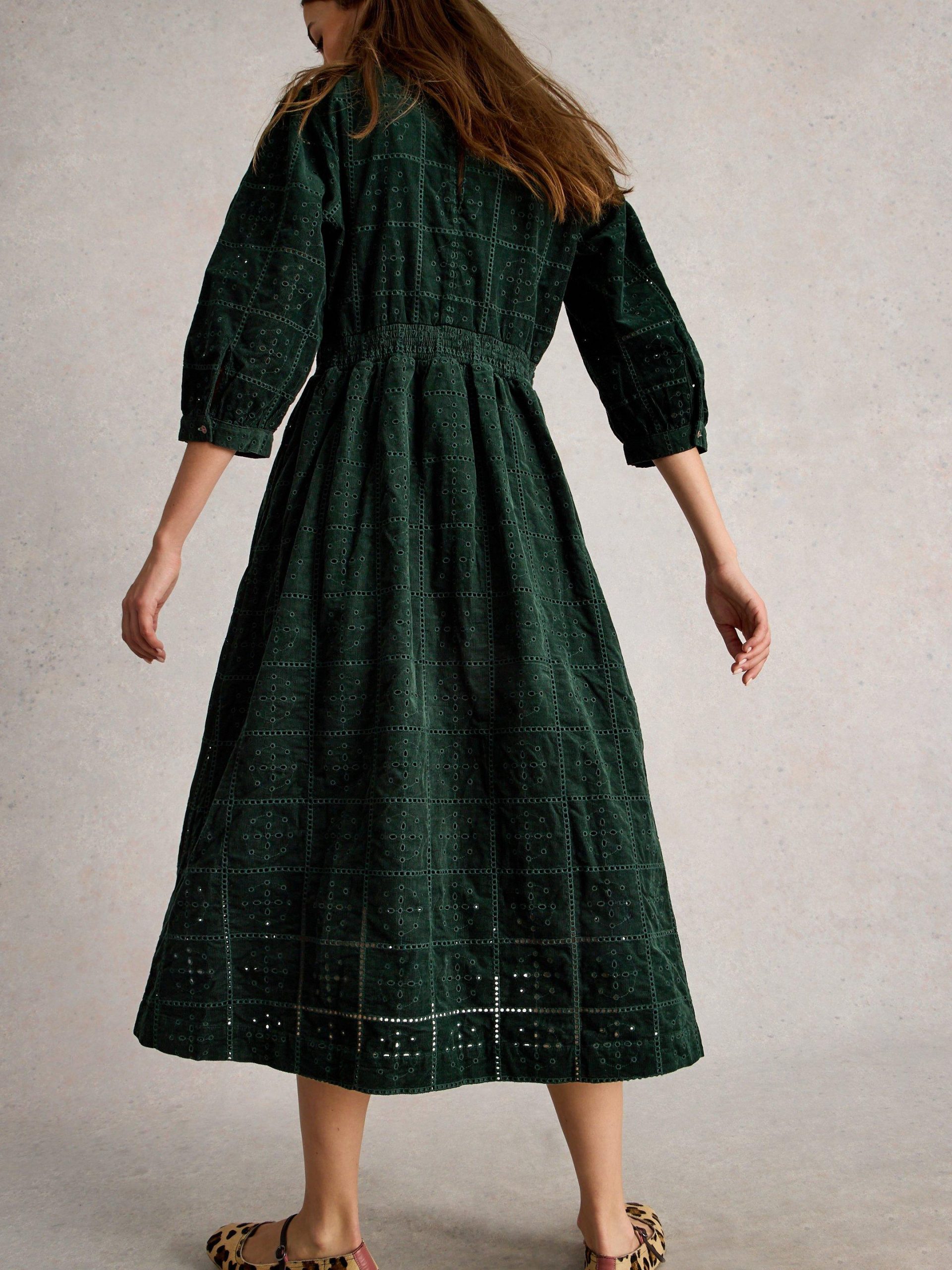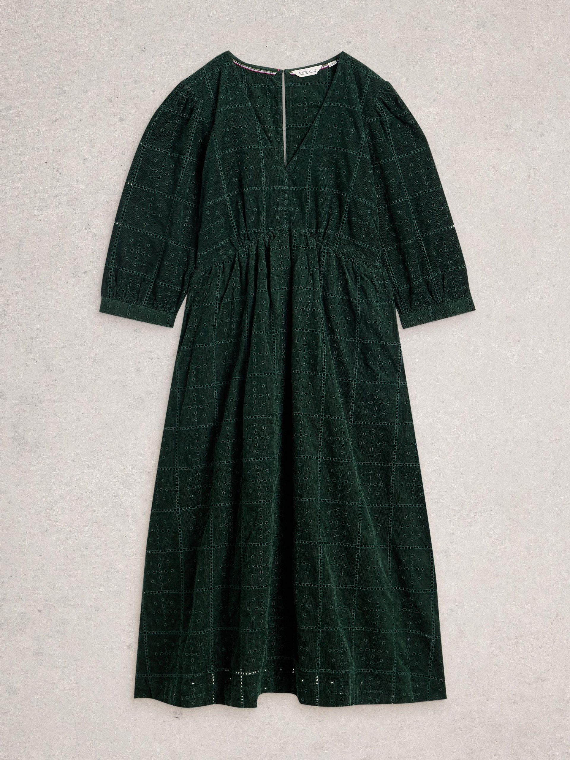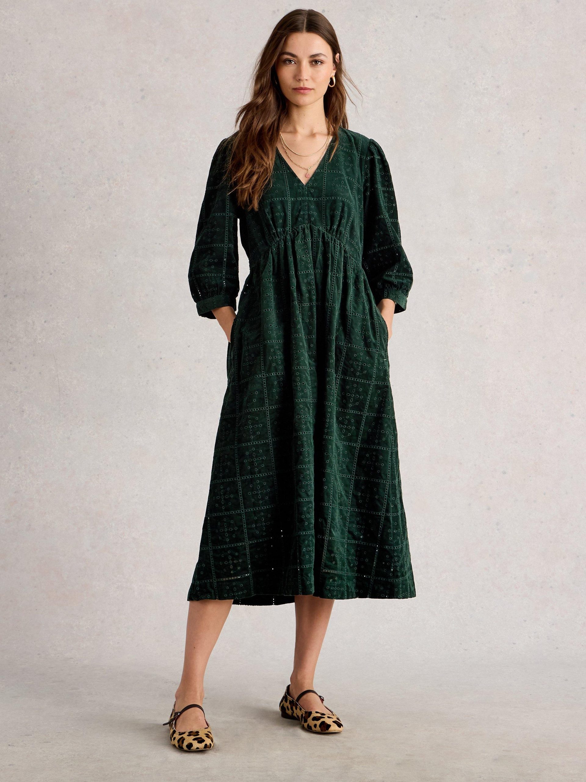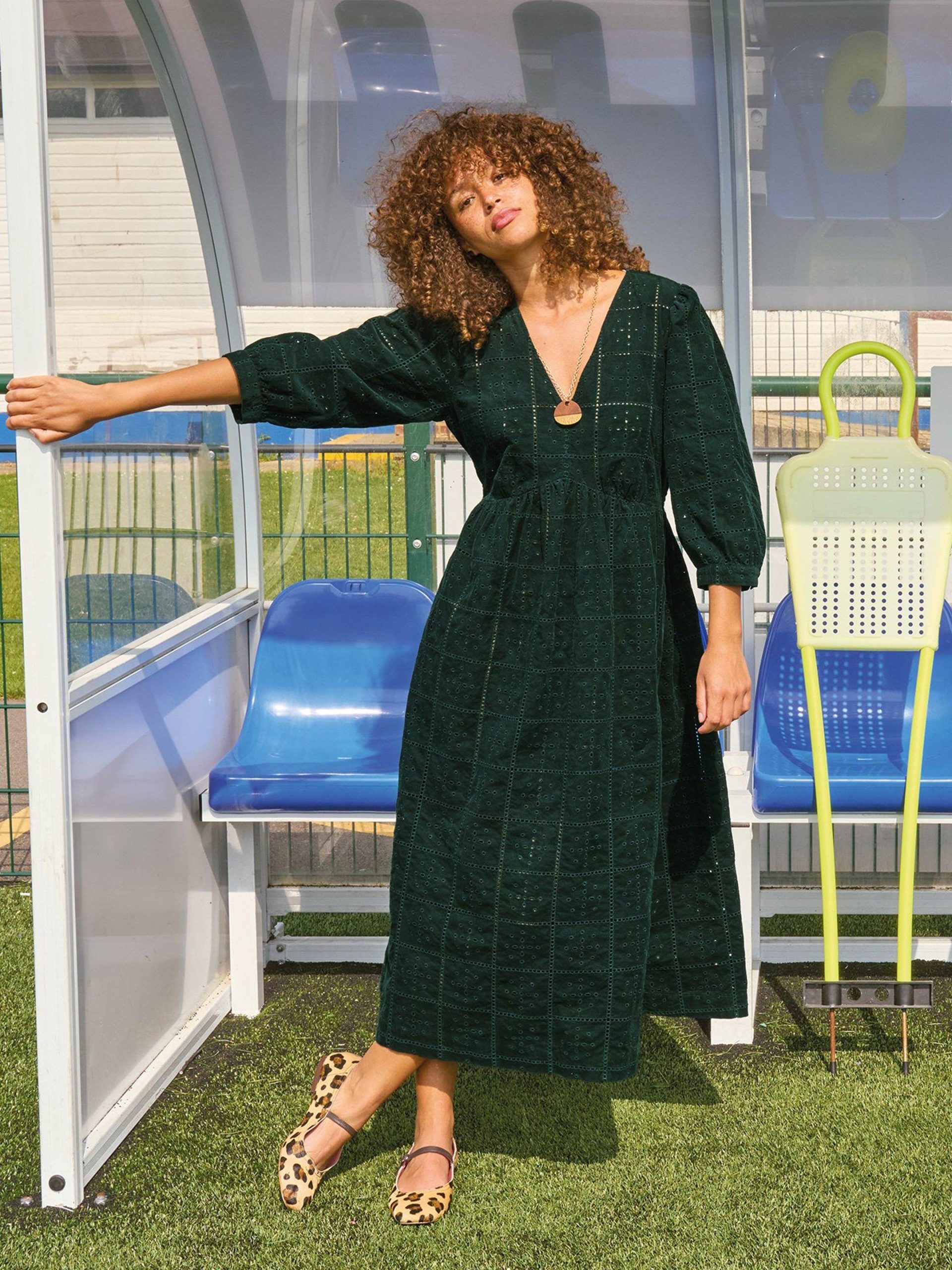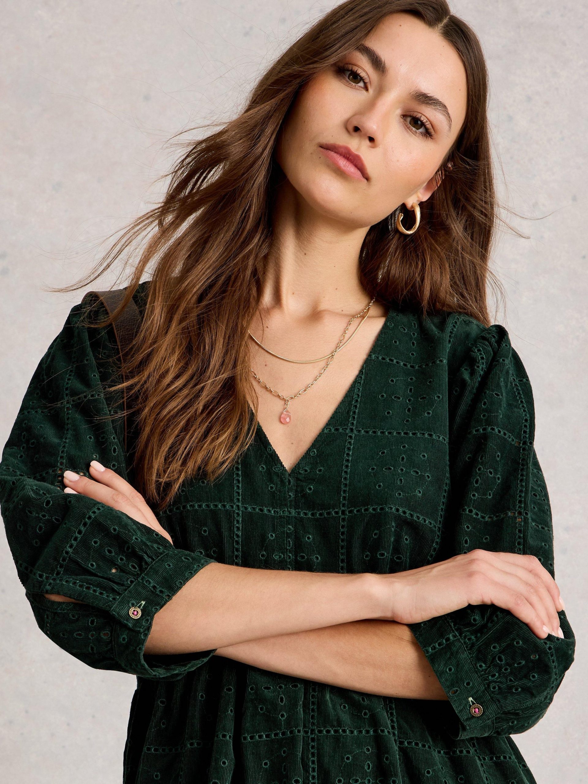 We’ve given our classic Lucy shape an autumnal refresh. Still made with 100% organic cotton, this cord dress has 3/4 length sleeves and gathering at the waist. (Look out for the broderie detail, too.)