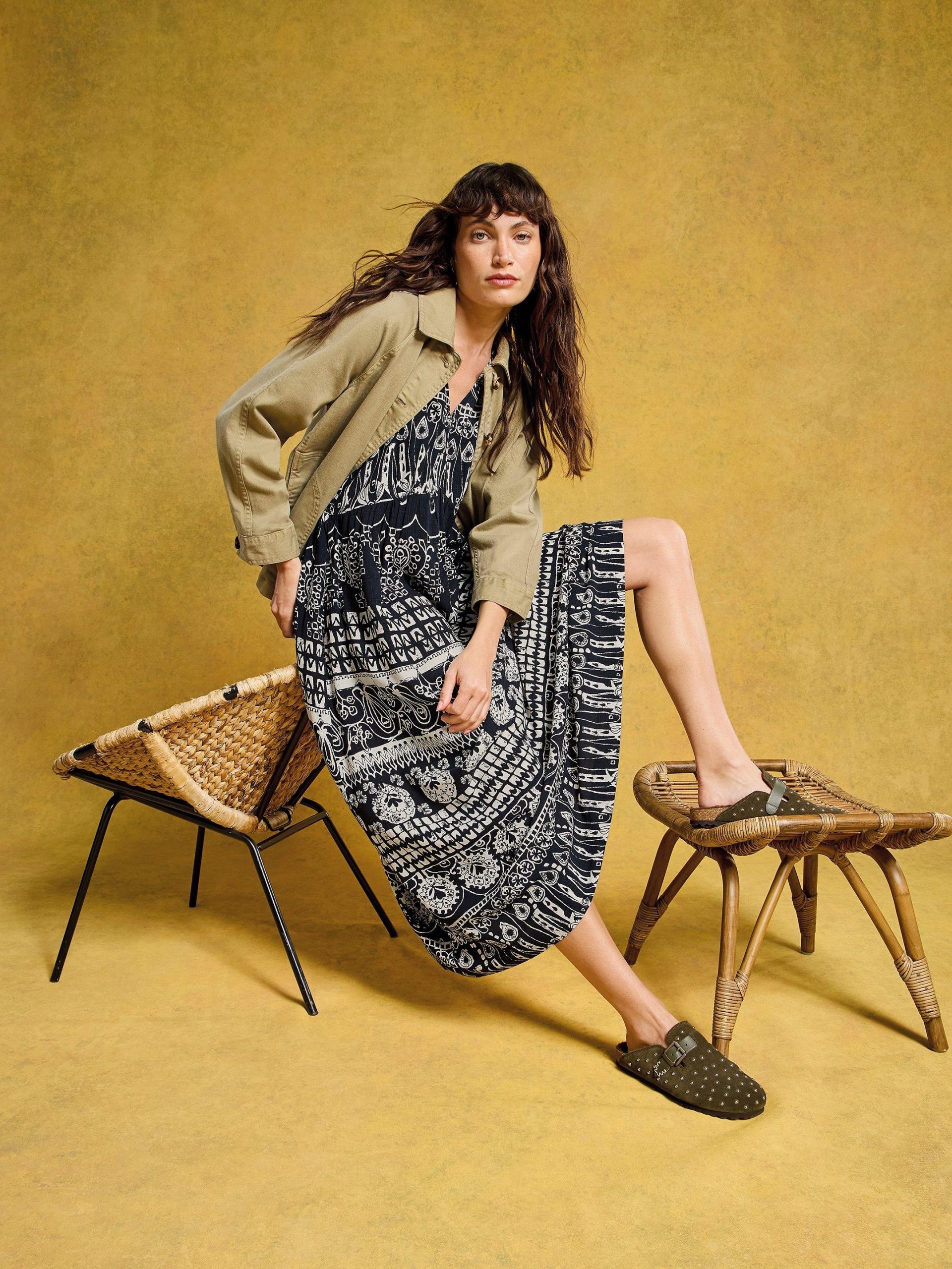 The dress that does errands and eveningwear without breaking a sweat. It’s 100% Ecovero viscose. Comfortable enough to be sensible. And detailed, printed and ruched enough to be a showstopper.