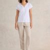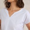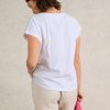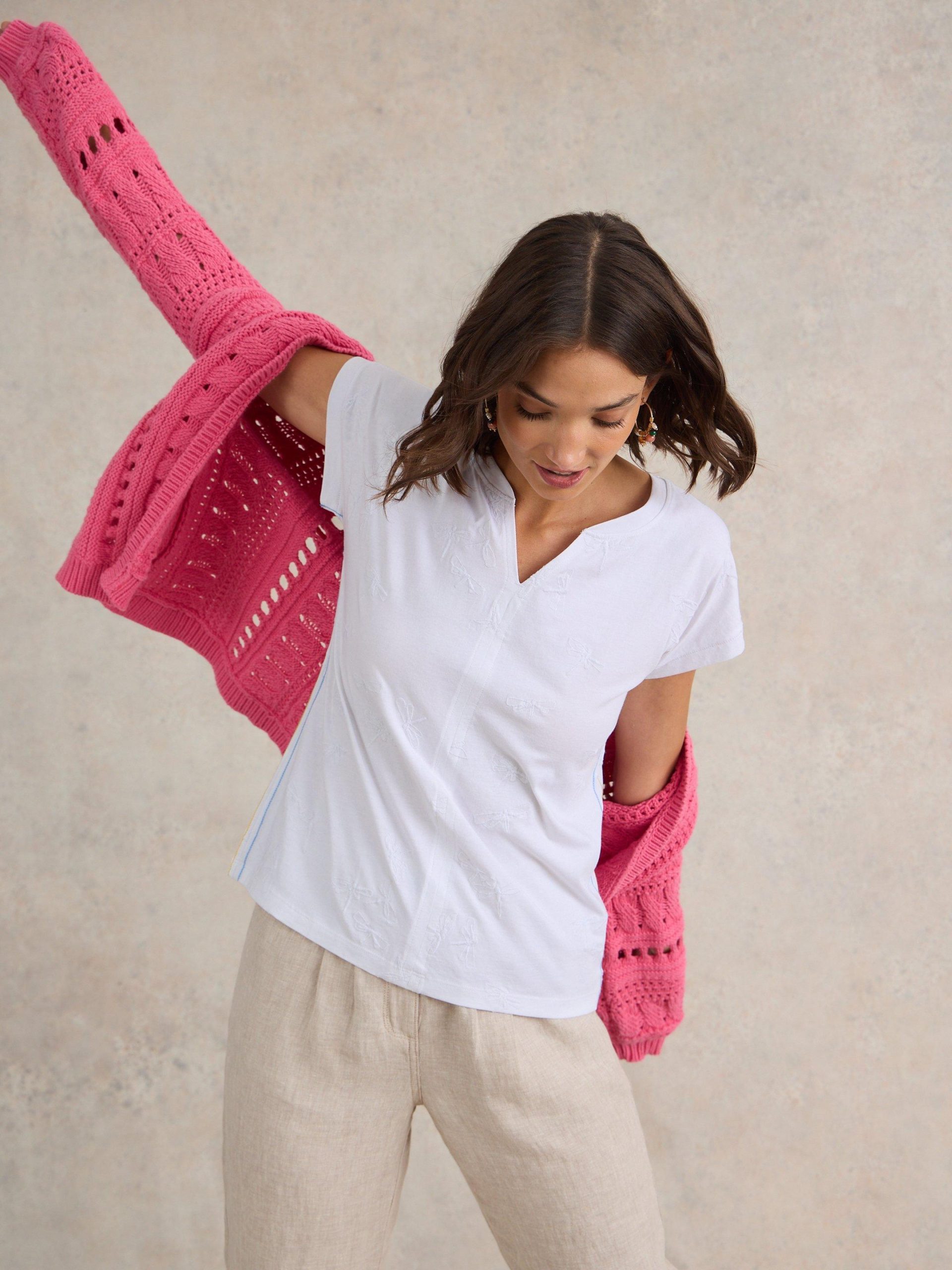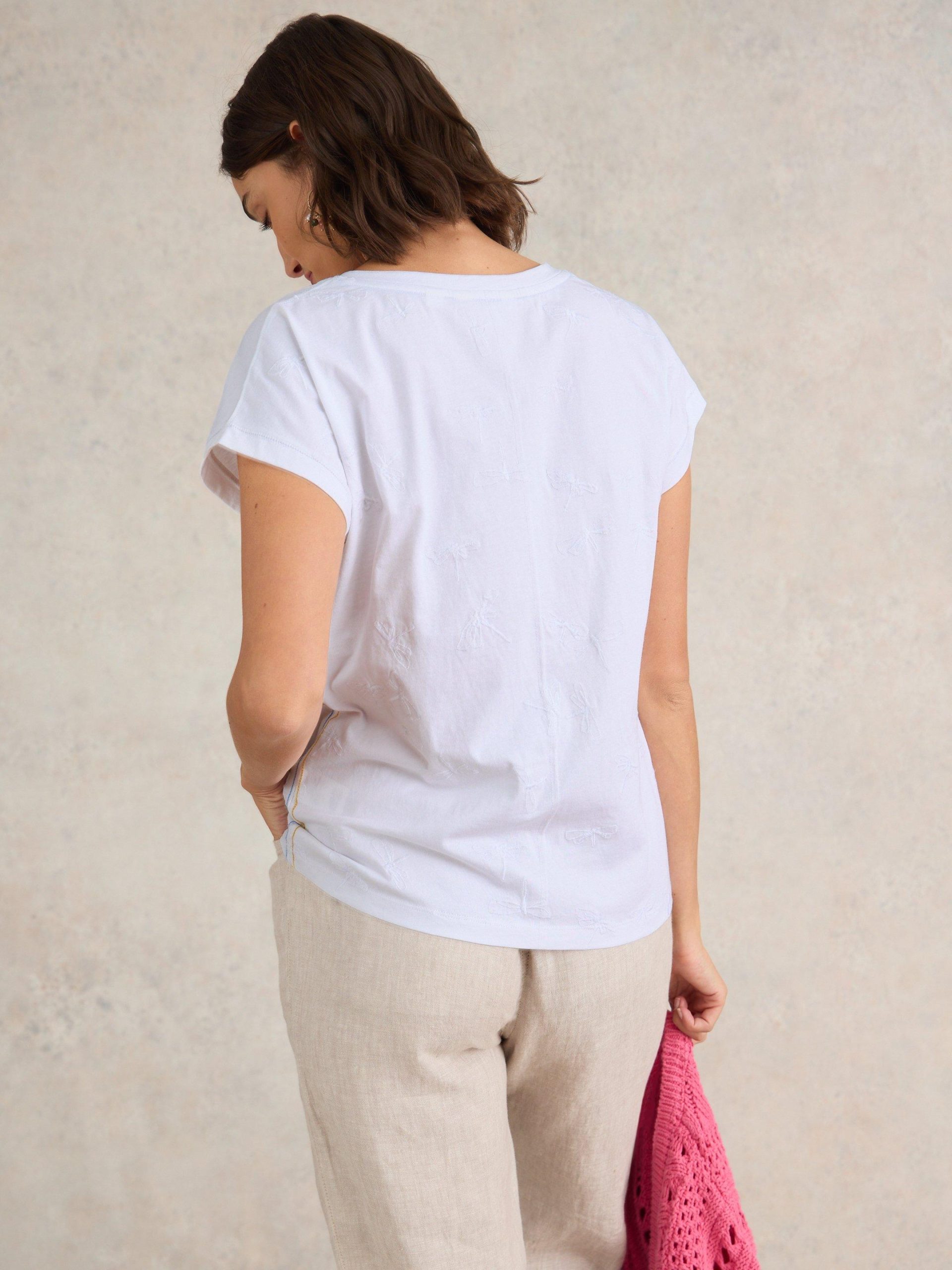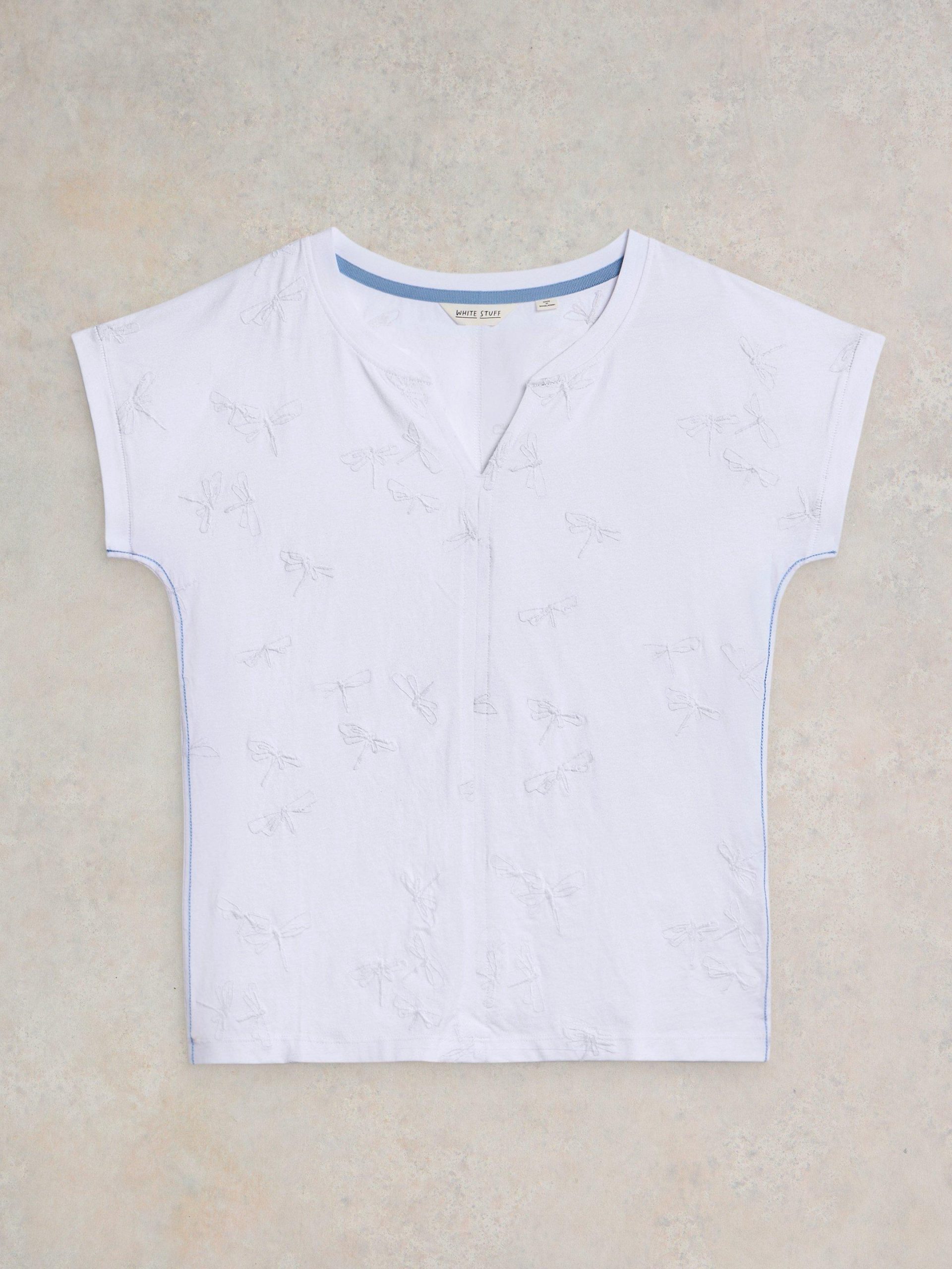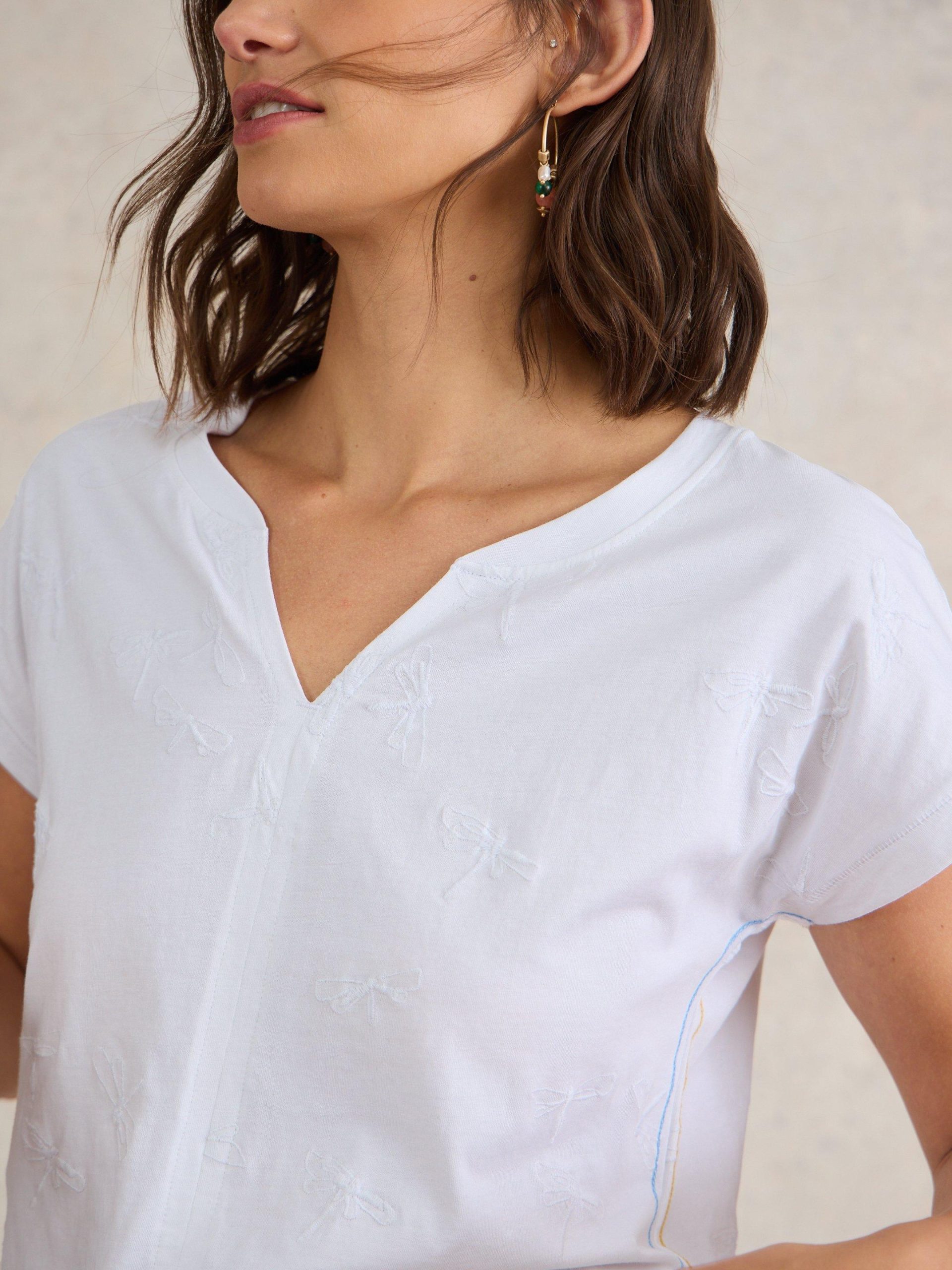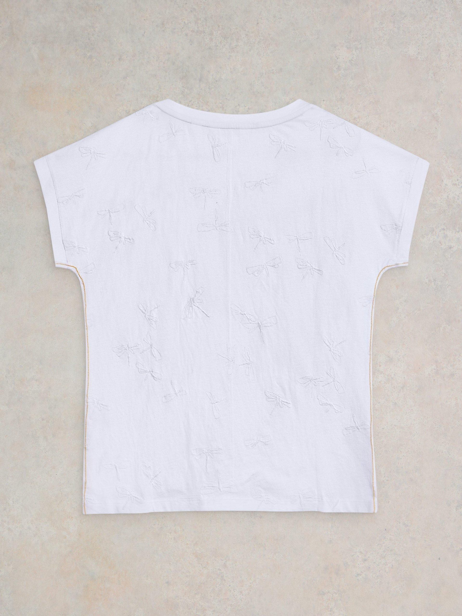 A notch-neck top with an all-over dragonfly embroidered design. Pretty fly for a white tee.