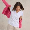 A notch-neck top with an all-over dragonfly embroidered design. Pretty fly for a white tee.
