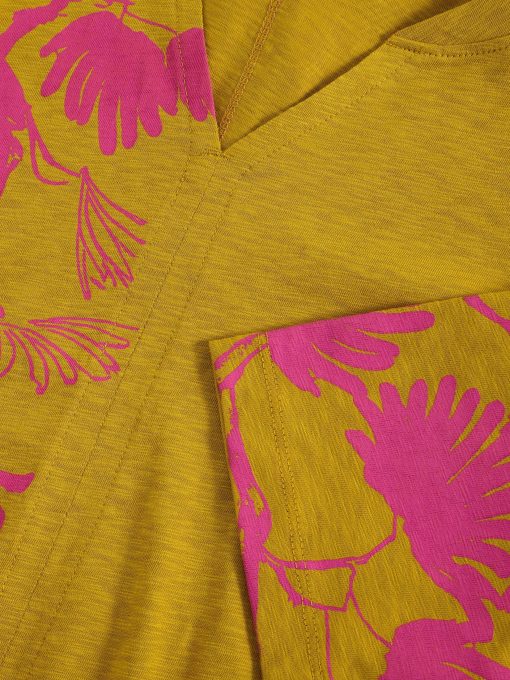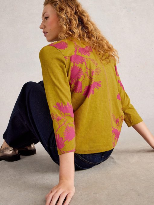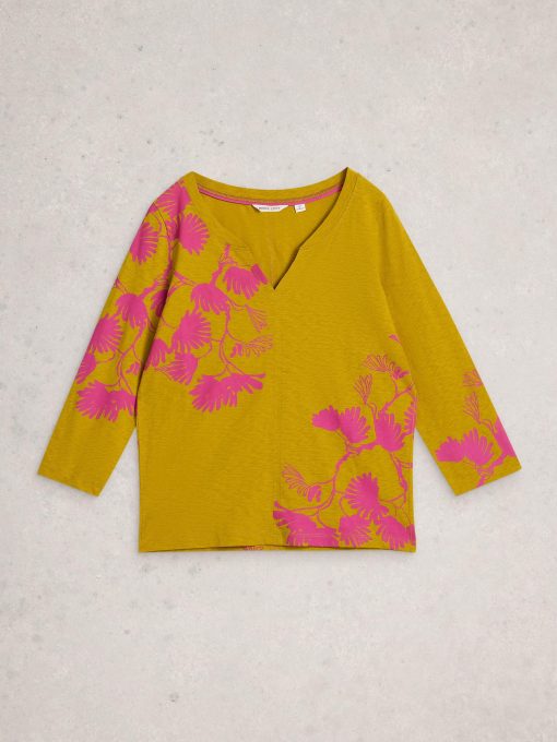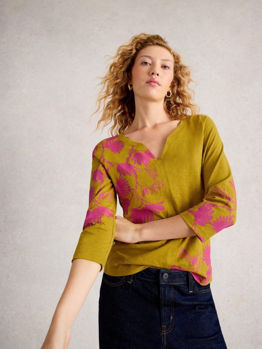 White Stuff Women’s Nelly Notch Neck Mid Sleeve Tee | Chartreuse Print