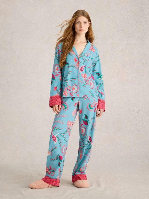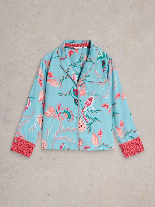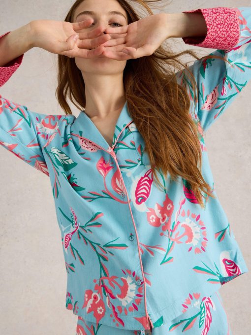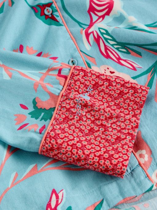A pyjama shirt with a contrasting print on the cuffs, a little colour pop and embroidered details. Add the matching bottoms and consider this your excuse to lounge.