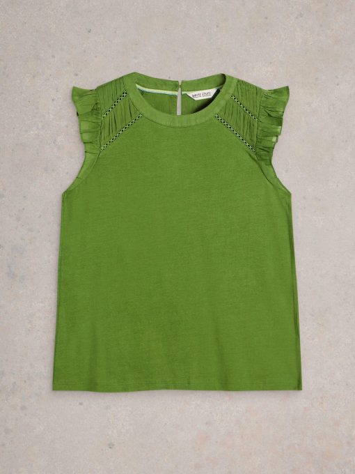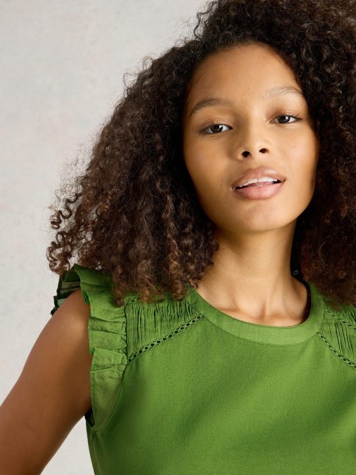 It’s all in the shoulders. Specifically broderie details and a few fun frills. This top is made with an organic cotton and LENZING™ ECOVERO™ viscose blend. We’re sold.