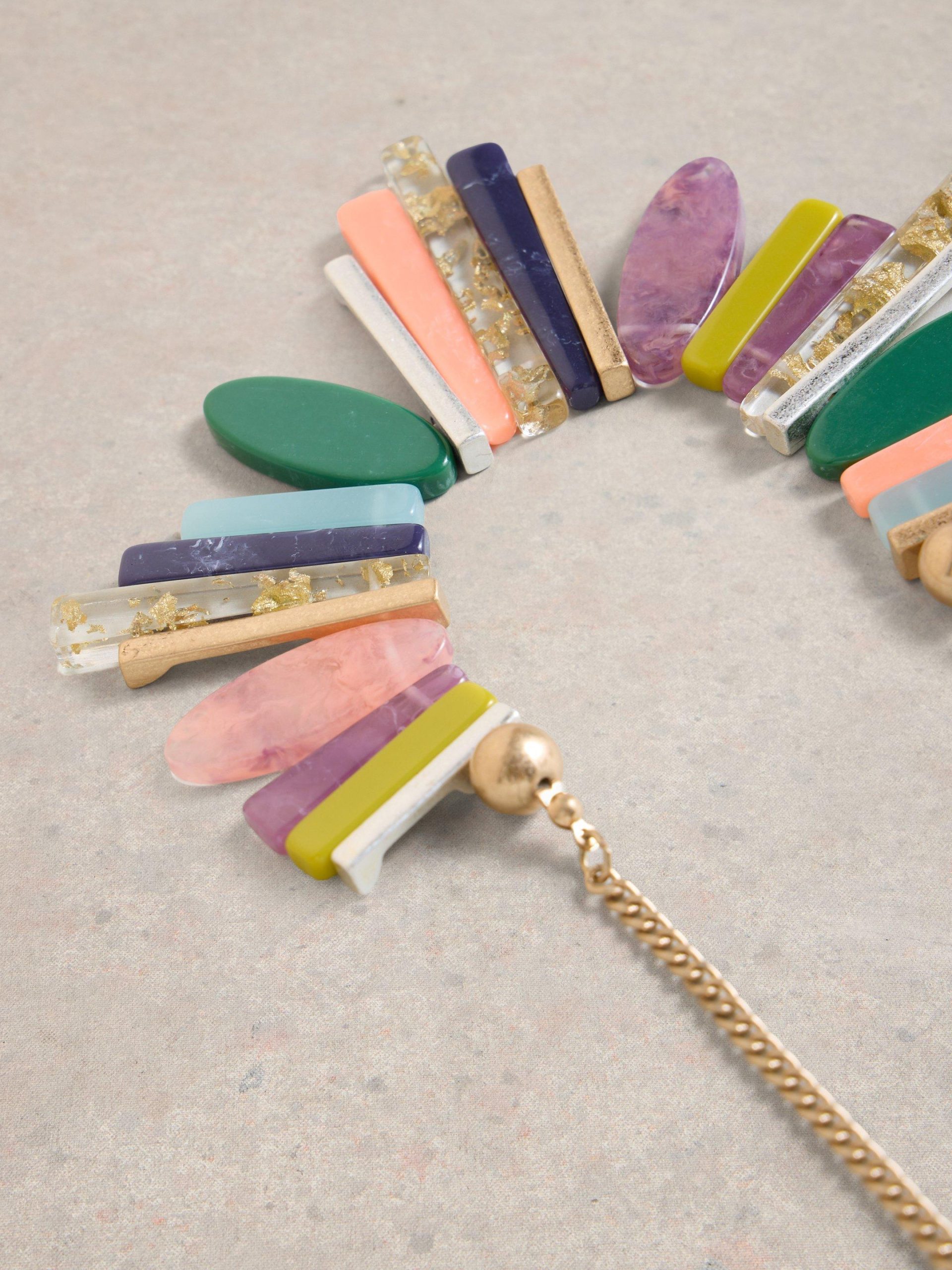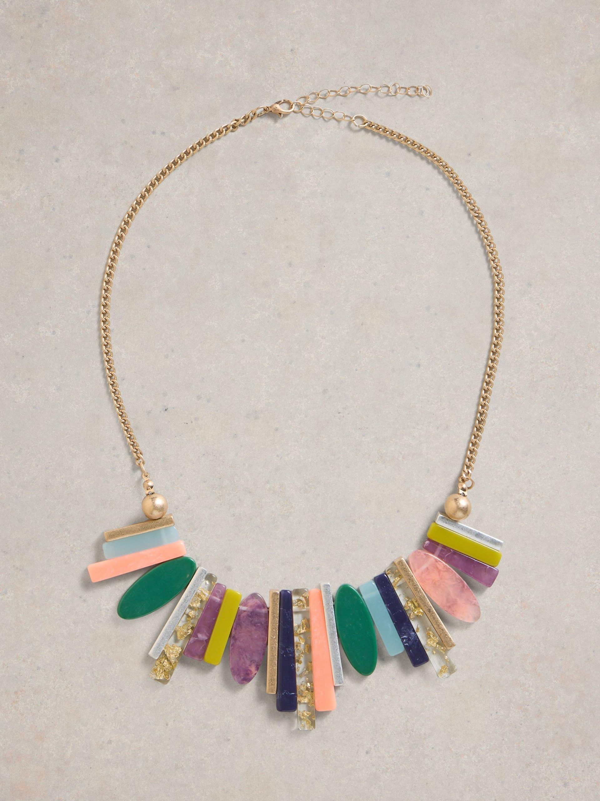A statement necklace with some colourful resin charms. We put all kinds of colours in this one. So it goes with all kinds of colourful outfits.nn