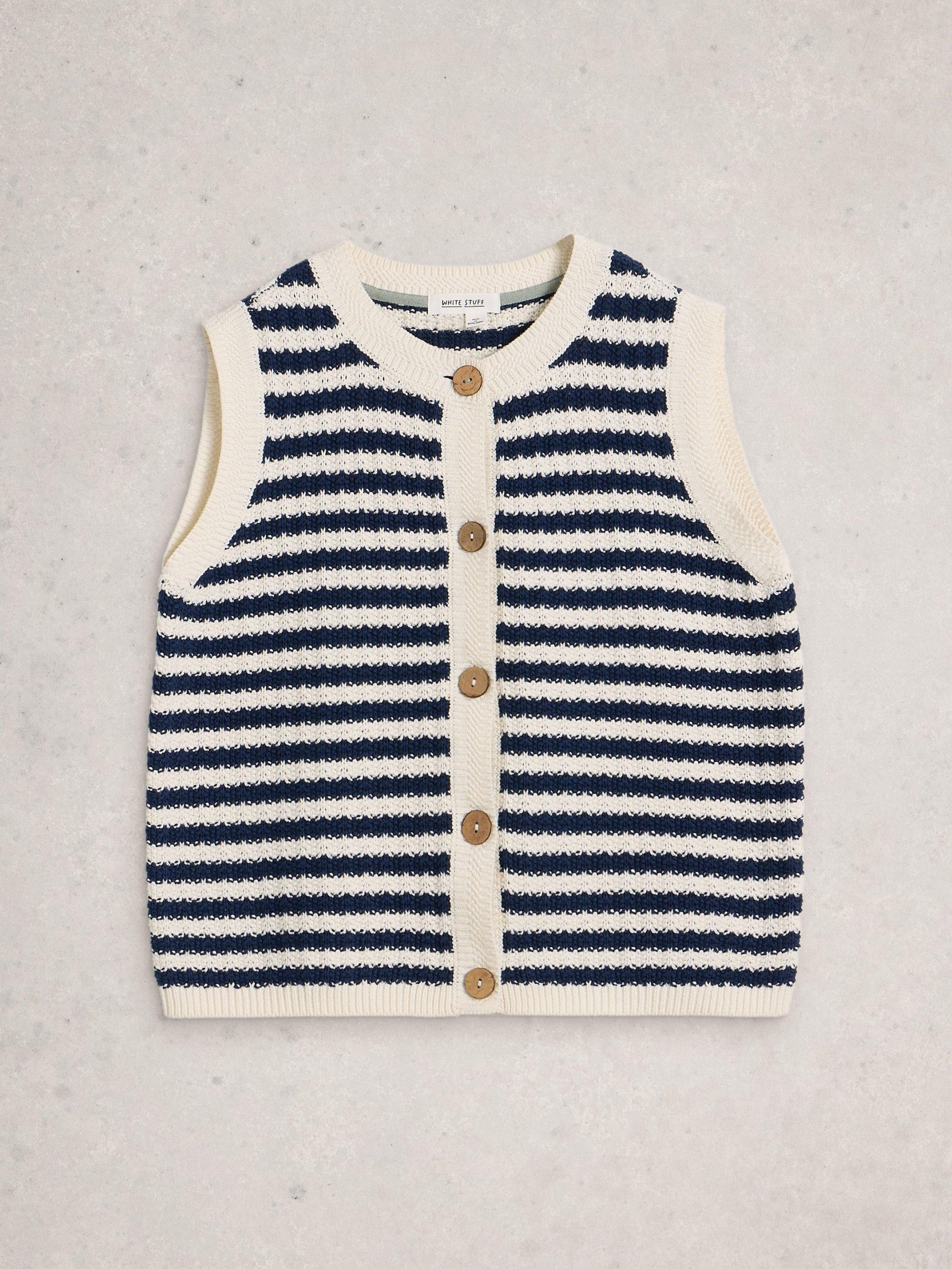 Don’t push your knitwear aside this summer. Rethink it with styles like this button-down tank. Layer over a white tee, pair with jeans and some slip-on mules.