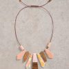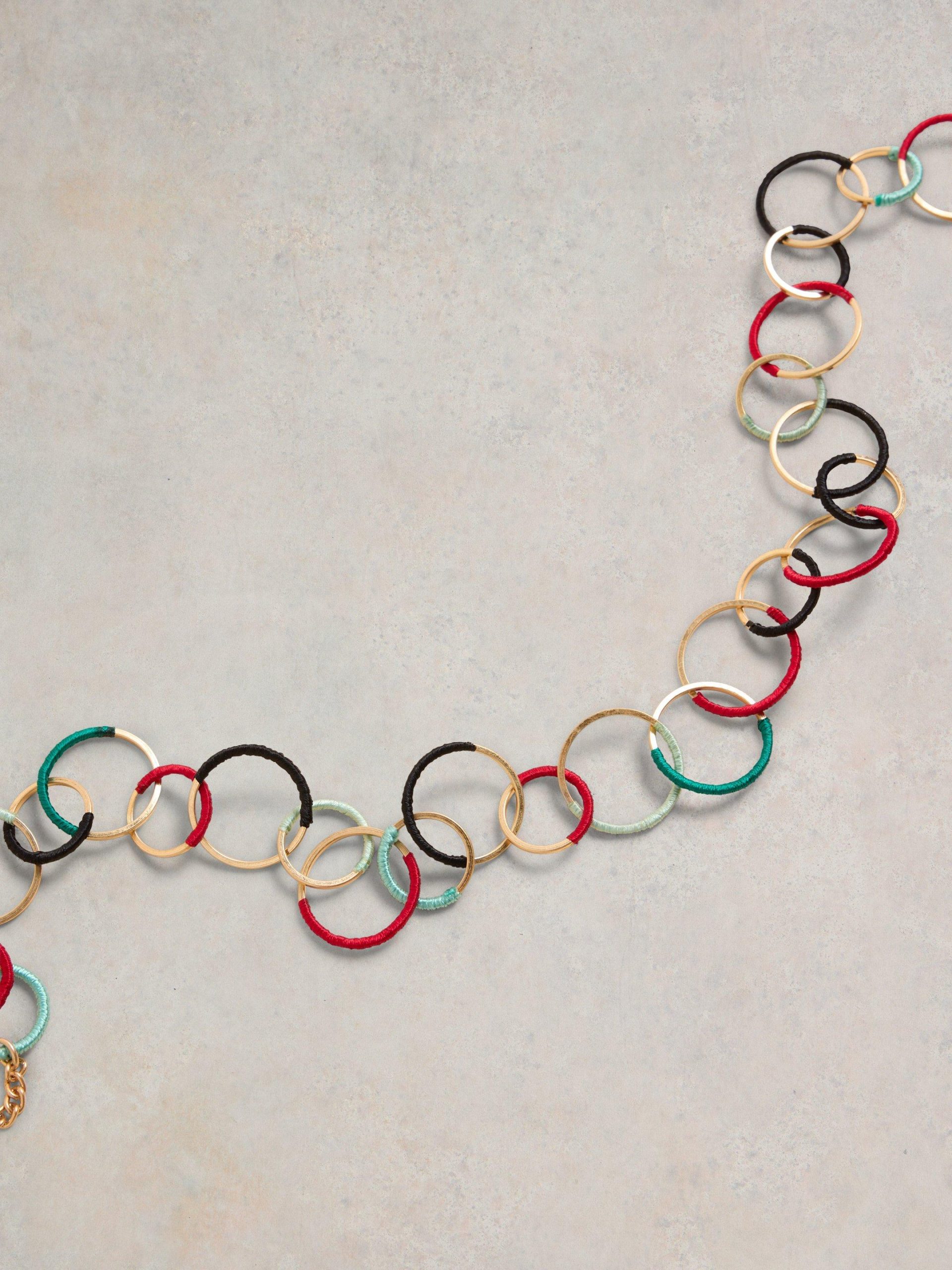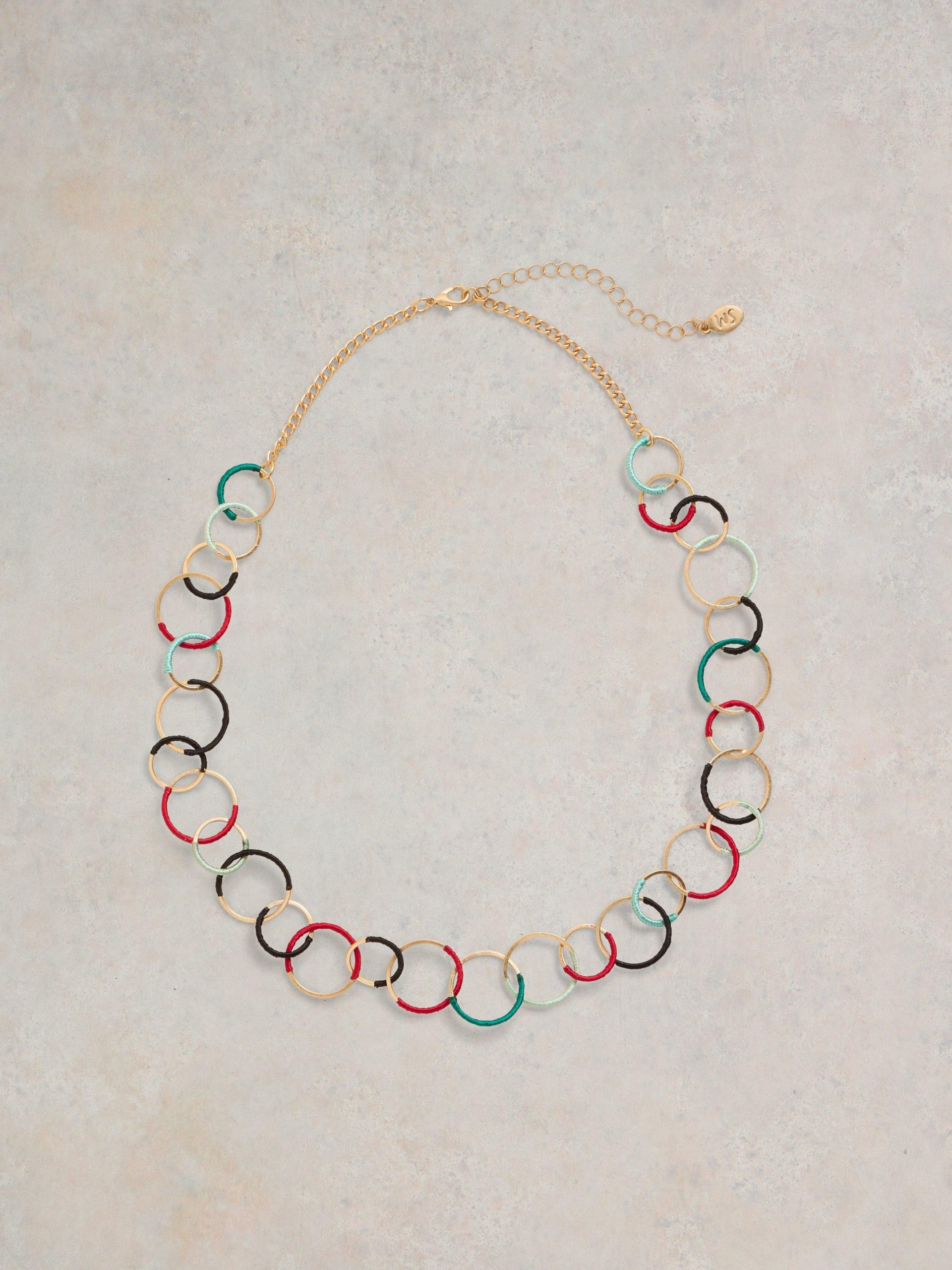 Bold colours. And nice wrapped hoops. This is a statement necklace you’ll circle back to time and again.